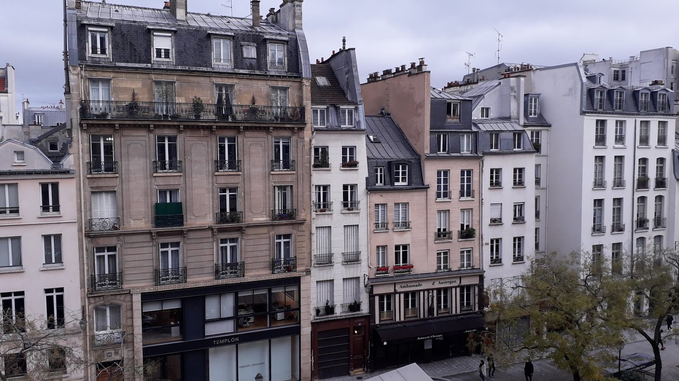Rue du Grenier St Lazare, rive nord pleine de charme, à gauche, immeuble 35 rue Beaubourg, à droite