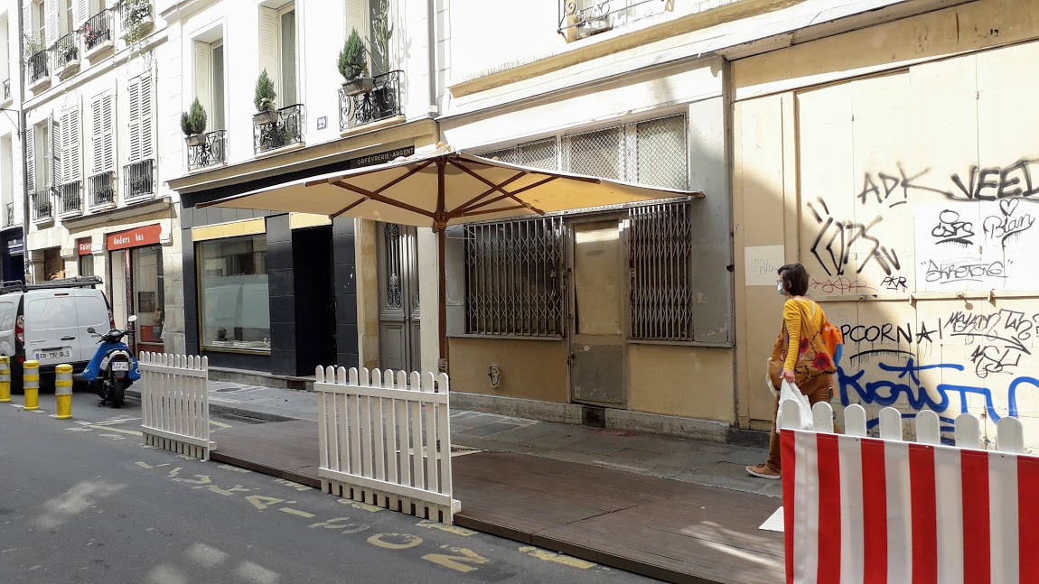 Gel des places de stationnement rue de Poitou. Terrasse éphémère 29 rue de Saintonge (IIIe)