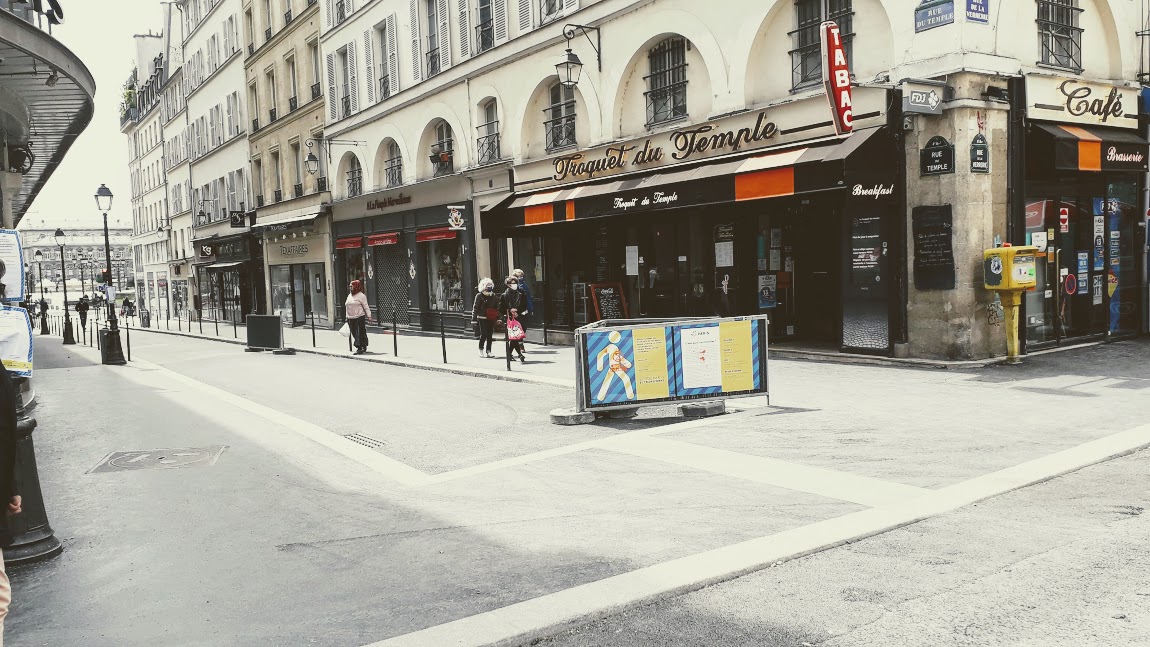 La rue de la Verrerie est sens dessus dessous. Des travaux de réaménagement de voirie sont en cours. On voit ici une des branches du carrefour avec la rue du Temple. Une nouveauté saute aux yeux : la continuité en hauteur du trottoir entre les deux rives.