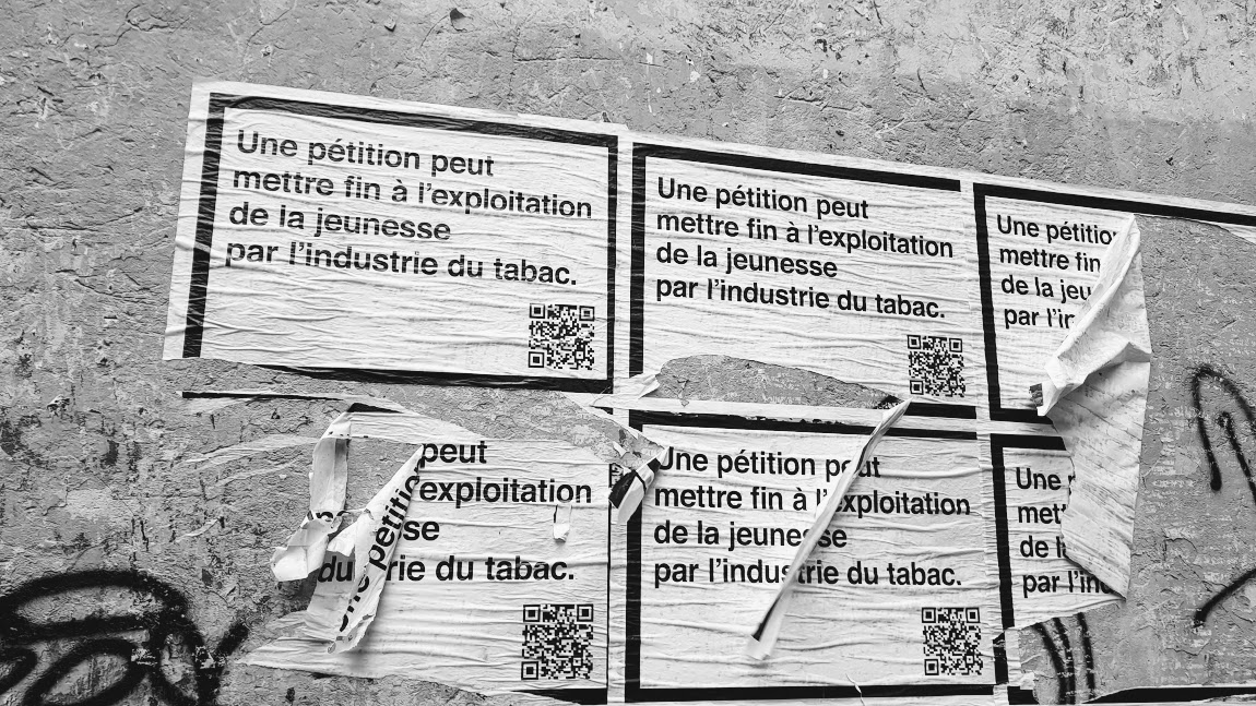 Ces affiches, sauvages, en mode placard, dénoncent l'exploitation des jeunes par les industriels du tabac. Elles proposent un QR code qui donne accès à une pétition. Une pétition contre le tabagisme ? On est tenté d'applaudir. Faut-il s'en réjouir pour autant ? La personne qui a lacéré ces affiches en tout cas ne semble pas vraiment le penser. A moins que son exécration de l'affichage sous toutes ses formes soit plus fort que son désir de protéger les jeunes contre les méfaits de la cigarette….