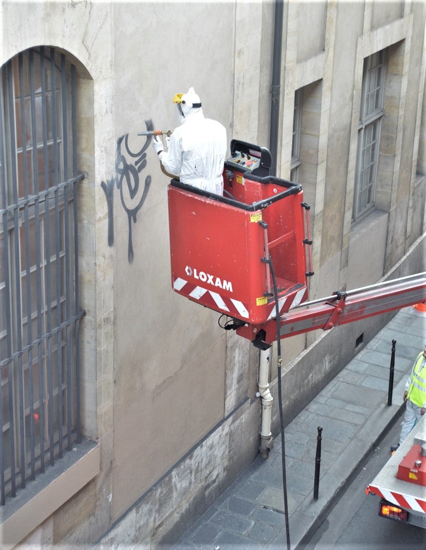 Voilà ce que des sagouins nous obligent à faire pour réparer leurs actes de vandalisme. Colombe Brossel, Adjointe à la propreté à l'Hôtel de Ville a tenu rapidement ses promesses. Elle a parlé de "nacelle", c'est bien de nacelle qu'il s'agit et la rue a dû être fermée pour réaliser l'opération.