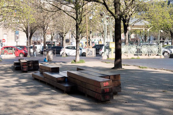 Le bulletin d'information n° 61 de la mairie de Paris-centre nous apprend que la place de la République "continue sa mue" avec le remplacement entre le 28 avril et le 6 mai 2022 de huit bancs en bois TVK actuels par huit bancs doubles Davioud.