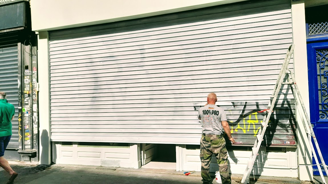 Une raison d'espérer : ce commerce de la rue Beaubourg (n° 73) est en train de faire peau neuve pour son rideau métallique. Le coin en bas à droite témoigne de l'état primitif…. Une deuxième couche sera nécessaire. Il faudra ensuite conserver ce rideau en l'état !