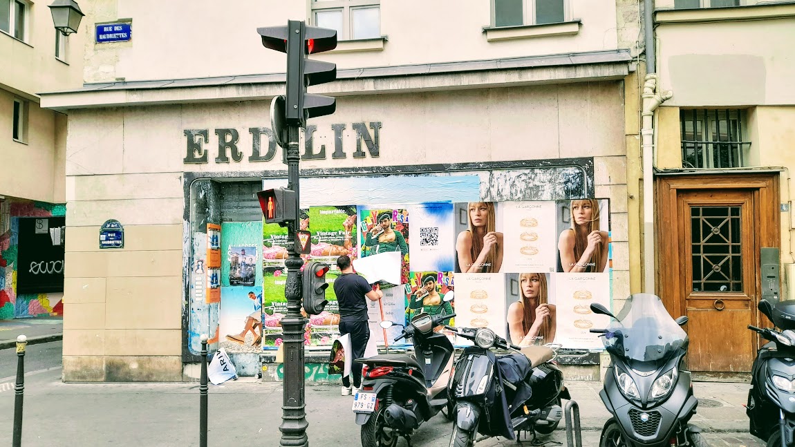 La façade dument enduite, il tourne le coin vers la rue du Temple pour y coller son solde d'affiches. De retour sur la façade principale rue des Haudriettes, il sort un appareil pour photographier son travail, une manière de montrer à son employeur qu'il a fait le job et doit être payé pour son travail illégal.