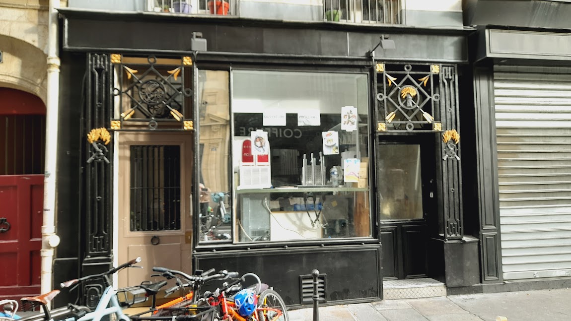Devanture élégante avec éléments en fer forgé 28 rue des Blancs-Manteaux (IVe), attenante à la brasserie "La Fronde" (Photos VlM, clic gauche pour agrandir)