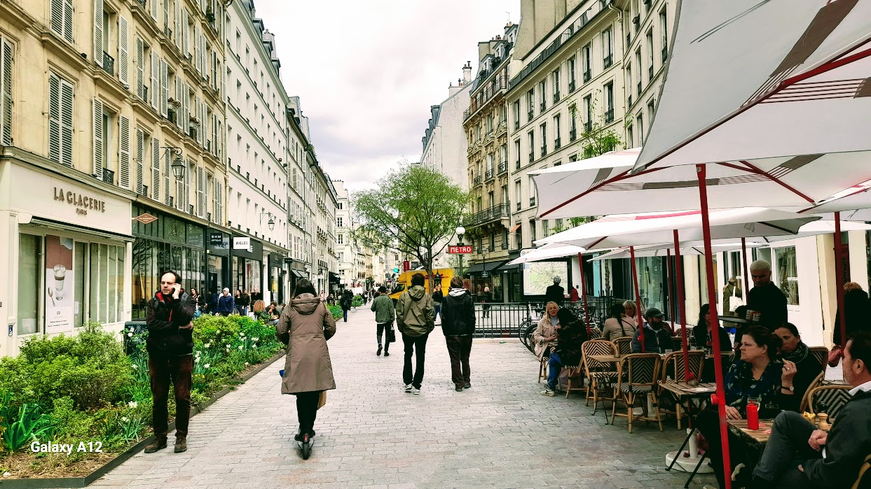 La photo montre la rue du Temple, entre les rues de la Verrerie et Ste Croix de la Bretonnerie dans le IVe, c'est un vaste espace pétons végétalisé qui s'offre aux pas des promeneurs. Les bars en ont profité pour étendre leurs terrasses mais leur emprise reste raisonnable au regard de la place laissée aux piétons.