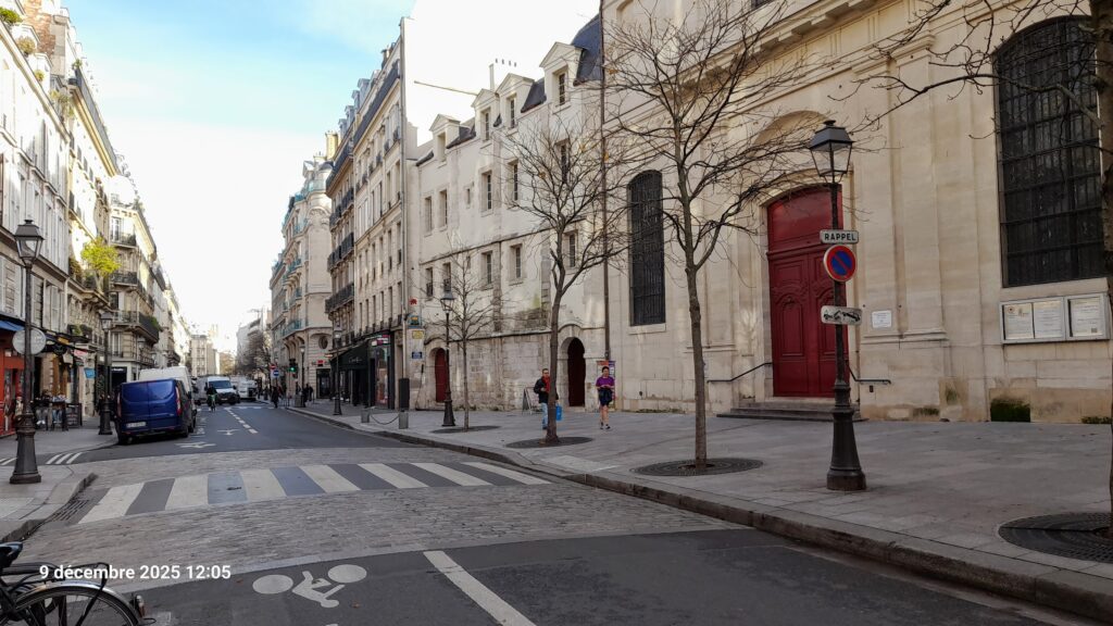 Rue des Archives apaisée, à hauteur de l’église protestante des Billettes (IVe)