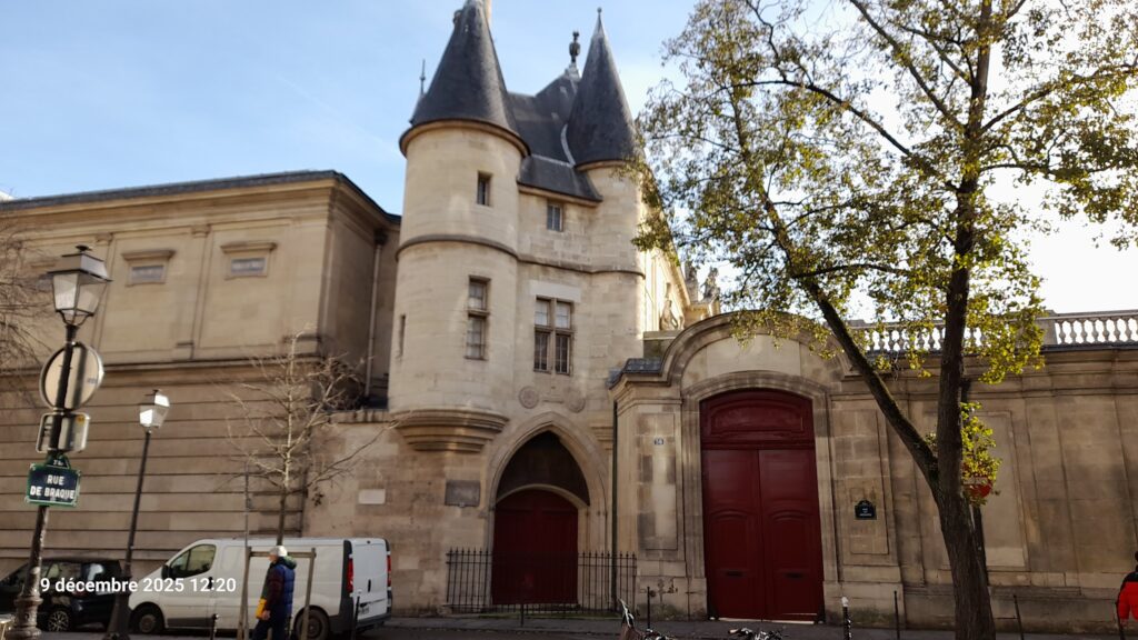 Les tourelles de l’Hôtel de Clisson, attenant à l’Hôtel de Soubise mais bien plus ancien, de style renaissance, début d’une série d’hôtels allant jusqu’à l’Hôtel de Rohan qui abrite les décors de la Chancellerie d’Orléans, en passant par les Hôtels d’Assy, de Breteuil, de Fontenay et de Jaucourt qui figurent la rive nord de la rue des Francs-Bourgeois (IIIe).