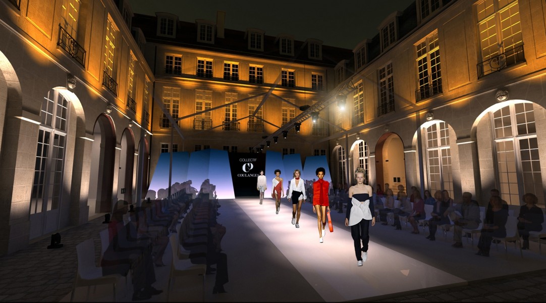 Photo montage d'un défilé de mode dans la cour de l'Hôtel de Coulanges
