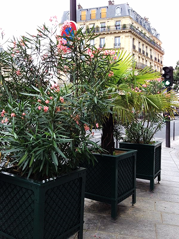 Quelle surprise pour les promeneurs et les parisiens de pouvoir côtoyer dans leur marche de magnifiques lauriers roses ainsi que des palmiers plantés par la Direction des Espaces Verts de la Ville de Paris dans des potiches qui se trouvent au croisement des rues de Turbigo et Réaumur ! Joliment fleuris ils donnent un air méditerranéen au carrefour et en poussant la comparaison on imagine certains quartiers de Nice. Mais arrêtons là les analogies nous sommes bel et bien dans la capitale, le temps particulièrement chaud a favorisé la pousse et la floraison de ces plantes du soleil qui rappelons le n'en sont pas moins toxiques…