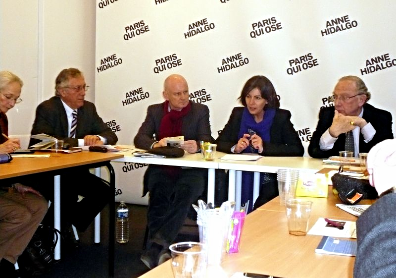 En partant de la gauche : Monique Bernardon-Fontaine et Gérard Simonet ("Vivre le Marais !"), Christophe Girard (Maire-candidat pour le IVe), Anne Hidalgo (1ère Adjointe au Maire de Paris et candidate à la mairie de Paris), Pierre Aidenbaum (Maire-candidat pour le IIIe). Etait présent également Philippe Ducloux, Maire-Adjoint de Paris chargé notamment du suivi des "états généraux de la nuit" (Photo VlM)