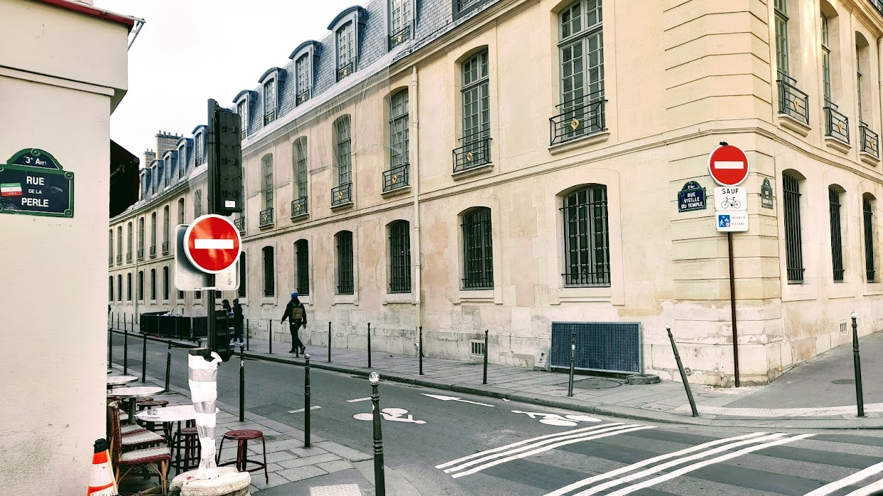 Premier indice de la mise en œuvre du nouveau plan de circulation du Marais : le tronçon de la rue Vieille du Temple qui va de la rue des Francs-Bourgeois à la rue des Quatre-Fils a subi une inversion du sens de circulation. Quand on vient du nord en parcourant la rue Vieille du Temple, au croisement de La Perle ou des Quatre-Fils, il faut aller à droite. Cinquante mètres plus loin on sera bientôt bloqué car la rue des Quatre-Fils va elle aussi changer de sens !