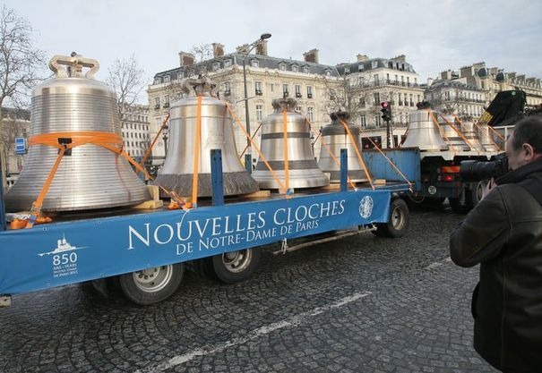 Les 9 nouveaux carillons sont arrivés hier, 31 janvier à Paris, sur des camions escortés par des motards, de la Porte Maillot à Notre Dame où elles ont été accueillies par leurs « sœurs » en place sonnant à toute volée.