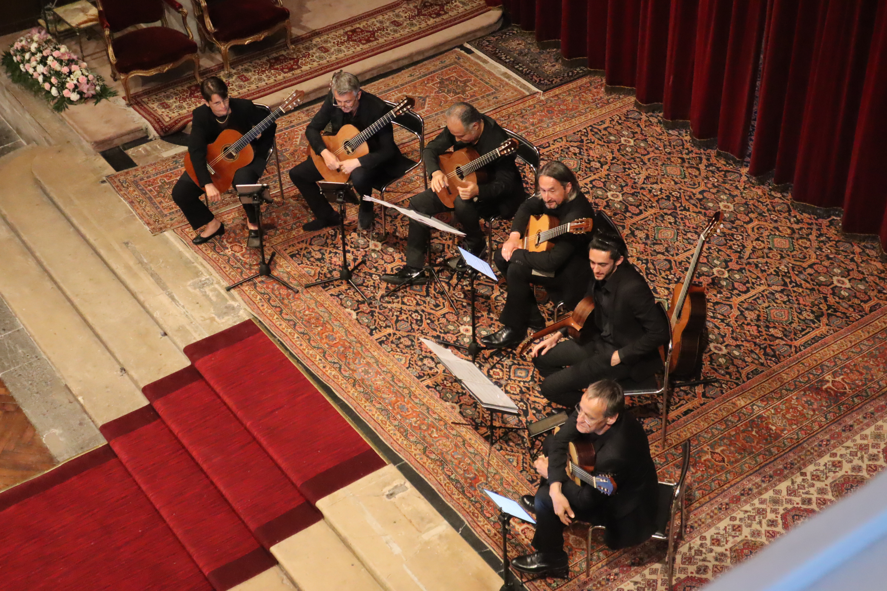 Les spectateurs se sont pressés hier soir 14 juin pour voir et écouter les six guitaristes classiques de la formation COPLA. La photo prise de l'assistance atteste du nombre et de l'enthousiasme des participants qui ont fait une véritable ovation à des artistes talentueux qui se donnent à la musique dans une relation fusionnelle où l'humour a aussi sa place.