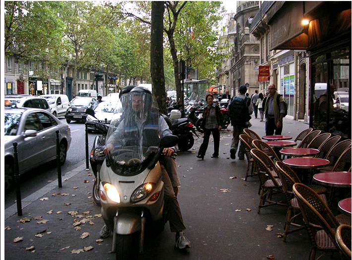 Un exemple d'incivilité boulevard Sébastopol : rouler en moto sur un trottoir (Photo Le Monde)