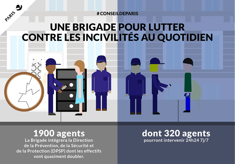 Colombe Brossel, Adjointe à la Maire de Paris pour la sécurité, la prévention et l'intégration, passe en revue des effectifs de la DPSP (direction de la prévention, de la sécurité et de la protection), sorte de police municipale qui fait la chasse aux incivilités à Paris (Photo WordPress)Matthieu Clouzeau, commissaire divisionnaire Directeur de la DPSP nous l'avait annoncé lors de notre rencontre du 26 octobre 2016, le BACN (bureau d'action contre les nuisances) avait vocation à rejoindre les effectifs de la DPSP. Ces dernières années, nous n'avons eu qu'à nous louer de l'efficacité de ce bureau, notamment dans les affaires de nuisances sonores d'origine professionnelles. Le commissaire Clouzeau nous avait rassurés en indiquant qu'il reprendrait l'intégralité de ses effectifs et maintiendrait leurs méthodes de travail inspirées des normes qualité ISO 9001.La loi du 28 février 2017 relative au statut de Paris et à l'aménagement métropolitain prévoit une nouvelle répartition des compétences entre la Ville de Paris et le Préfet de Police. A ce titre, à compter du 1er juillet 2017, les signalements en matière de nuisances sonores et olfactives sont adressés à la DPSP (et non plus à la Préfecture de Police, quai de Gesvres) :Direction de la prévention, de la sécurité et de la protectionSous-direction de la tranquillité publiqueBureau des actions contre les nuisances professionnelle5 rue Lobau75 004 Paris
