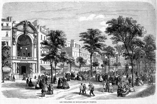 Si je me permets de venir vers vous, c’est que mes arbres ne sont pas plantés n’importe où : au 19ème siècle, le boulevard du Temple était un des hauts lieux de la capitale. Le Tout-Paris s’y promenait sous ses arbres centenaires. Bordé de dizaines de théâtres, son surnom était "le boulevard du Crime", car chaque soir d’illustres comédiens y mourraient dans de violents mélodrames.