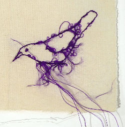 "Les subtils fils de soie sortent des coutures en s’éparpillant, comme les coulées des couleurs, s’effrangent, voltigent, et les maisonnettes et les oiseaux deviennent contes de fée, profils, icônes. L’espace de l’installation devient image d’un lieu de création, chambre pour recueillir les fragments d’un monde quotidien, et révéler les liens d’enchantement et d’ombre entre la stabilité et l’inattendu."