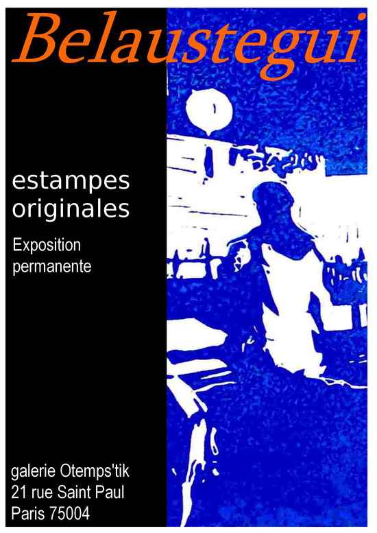 La galerie Otemps'tik 21 rue Saint Paul (IVe) présente les « Estampes originales contemporaines de Jean-Michel Belaustegui ». L’artiste initié très jeune à la photographie «… fait converger » dit la critique « la photographie, le dessin et la peinture dans des estampes à fort impact esthétique. » Les estampes de linoleum gravé "révèlent toute l'esthétique de notre monde urbain, de l’homme dans son univers urbain." Toutes sont réalisées entièrement à la main, signées et numérotées.