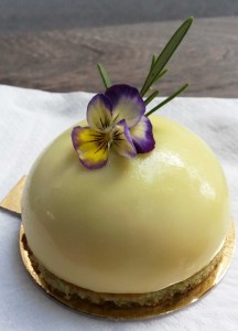 Une des spécialités de Pain de Sucre, un biscuit à la pistache et à la pulpe de rhubarbe avec une infusion de romarin décoré par une fleur de pensée