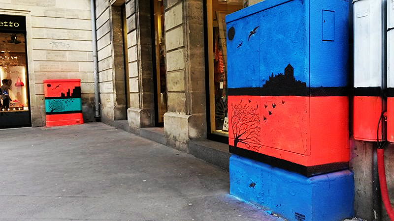 Ces armoires seront repeintes un jour car c'est leur vocation d'être uniformément marron, comme toutes leurs consœurs de Paris mais on se hâtera lentement. En rappelant  aux "artistes" non sollicités qu'il existe un danger d'électrocution à peindre ces équipements et qu'il ne faudrait pas qu'ils en soient les victimes.