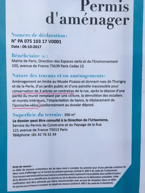 A gauche extrait du BMO du 31 octobre 2017 et à droite affichette apposée sur le site  concernant le permis d'aménager délivré pour le jardin à l'angle des rues de Thorigny et de la Perle (IIIe)