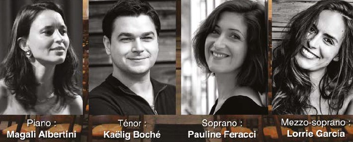 Ils sont cinq : Pauline Feracci soprano, Lorrie Garcia mezzo-soprano, Kaëlig Boché ténor, Thibault de Damas baryton-basse et leur accompagnatrice au piano Magali Albertini (au centre du bandeau), qui attendent de nous retrouver pour revivre avec nous et nous faire partager une soirée d'intense émotion.