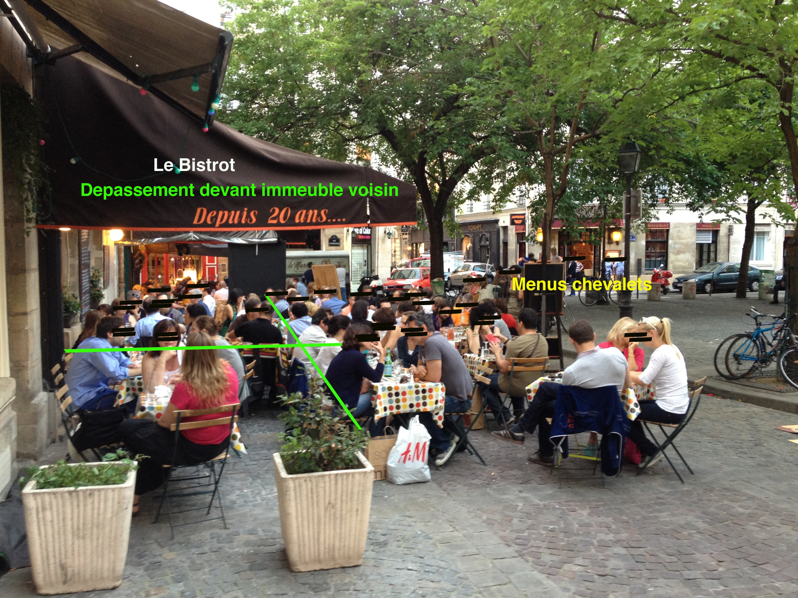 Marché Ste Catherine, occupation insensée de l'espace public. Les lignes vertes correspondent à l'autorisation de terrasse accordée par la Ville de Paris. Les riverains se mobilisent et font appel à "Vivre le Marais !" – Cliquez dans la photo pour agrandir –