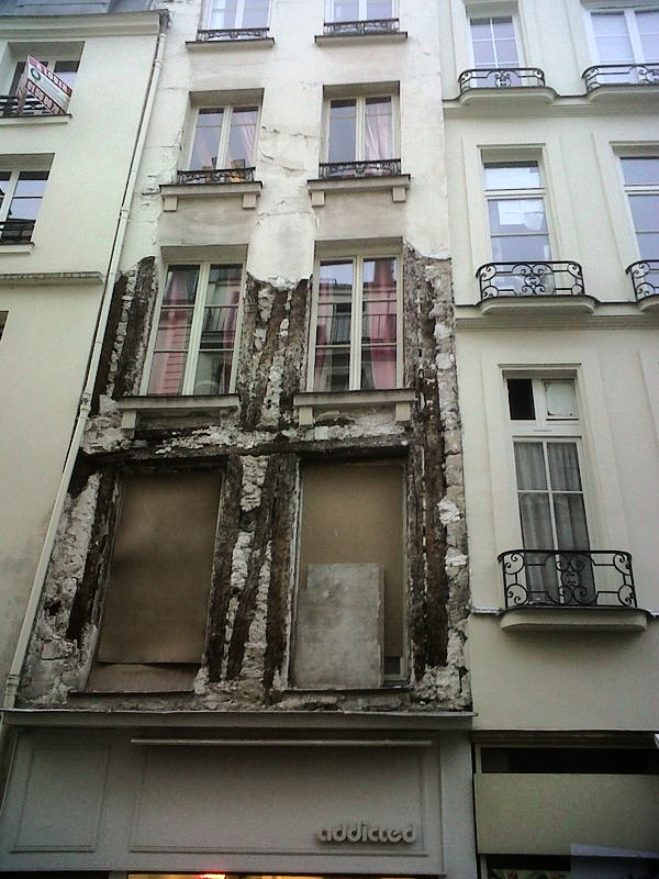 Au N° 29 de la rue du Temple (IVe) une vieille maison ancienne a perdu une partie de son enduit et laisse apparaitre l’ossature bois qui a servi à sa construction.