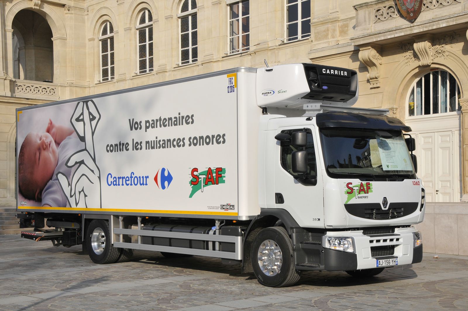Un camion aux couleurs de Carrefour et Staf avec son slogan anti bruit