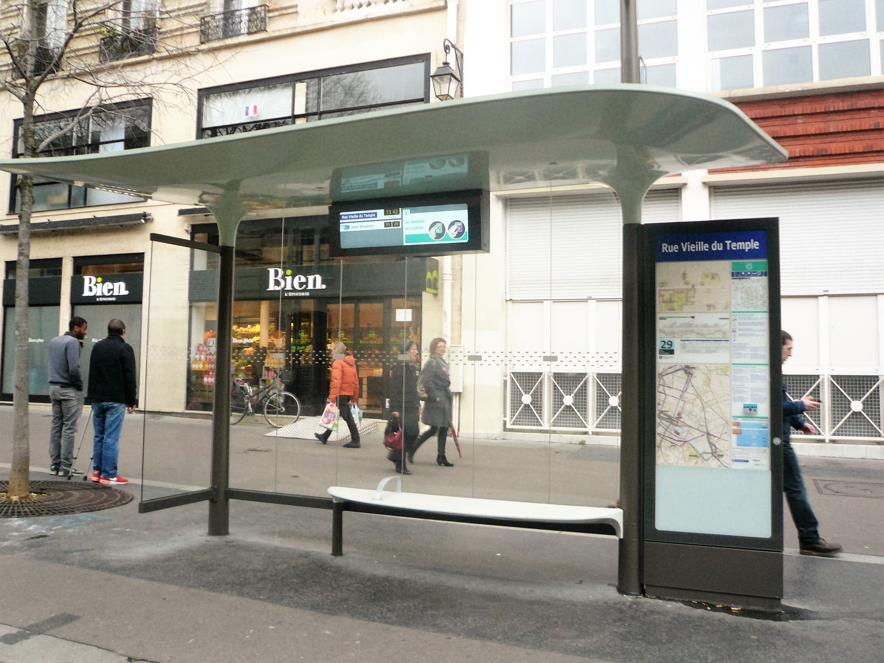 Dans un article du 20 mars 2015 nous écrivions à propos des nouveaux abribus, comme ceux installés rue Rambuteau, qu'ils ne faisaient pas l'unanimité, qu'ils étaient "mal abrités, exposés aux 4 vents… et si les usagers reconnaissent une belle ligne à ce mobilier urbain ils n'en étaient pas moins critiques quant à ses fonctionnalités pratiques… allant jusqu'à regretter les anciens abris qui les protégeaient mieux de la pluie ou du froid. Ils ne comprennent pas notamment pourquoi une partie de la paroi arrière est ouverte ?".
