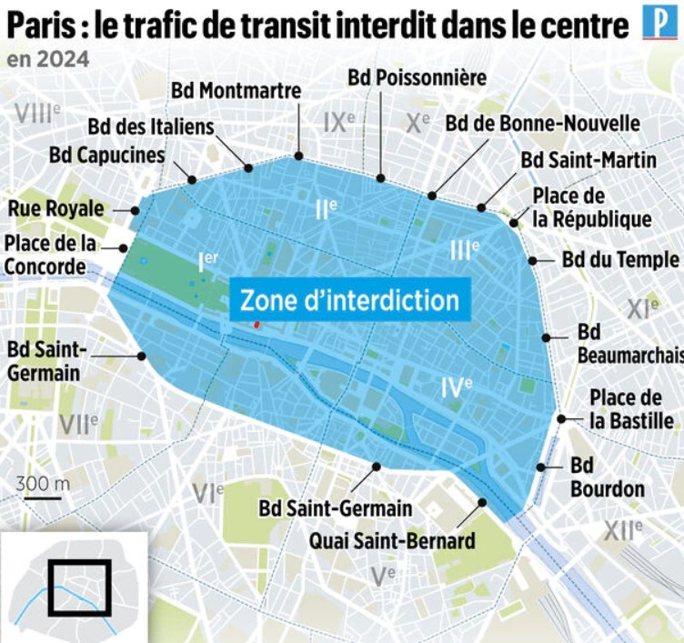 Infographie du quotidien "Le Parisien". La zone visée comprend Paris-centre augmenté de l'espace entre la Seine et le boulevard St Germain (Ve et VIe)