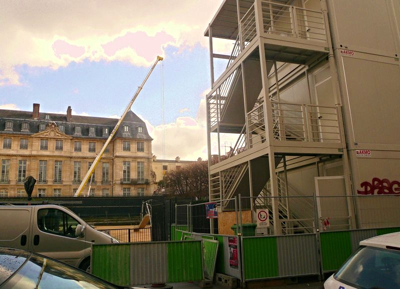Naïvement, nous croyions que le pire était passé avec la fin des travaux d’excavation de l’aile technique, en face du 97 de la rue Vieille-du-Temple. Mais nous dûmes déchanter. Un algeco de deux étages a été érigé dans la semaine du 3 février, sans naturellement qu’à aucun moment nous ayons été consultés ni même informés.
