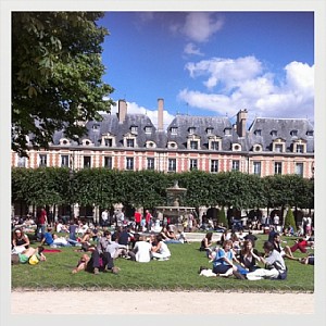 Touristes et parisiens sur les pelouses, place des Vosges