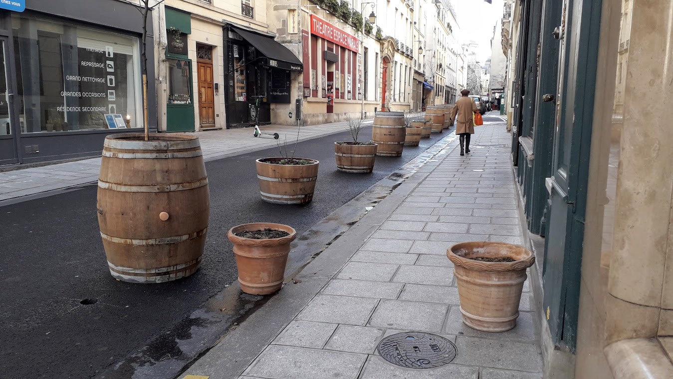 L'aménagement contesté de la rue Beautreillis (IVe) : tonneaux entiers ou sciés, en guise de ralentisseurs écologiques, en mal de vegétalisation… (Photos VlM)