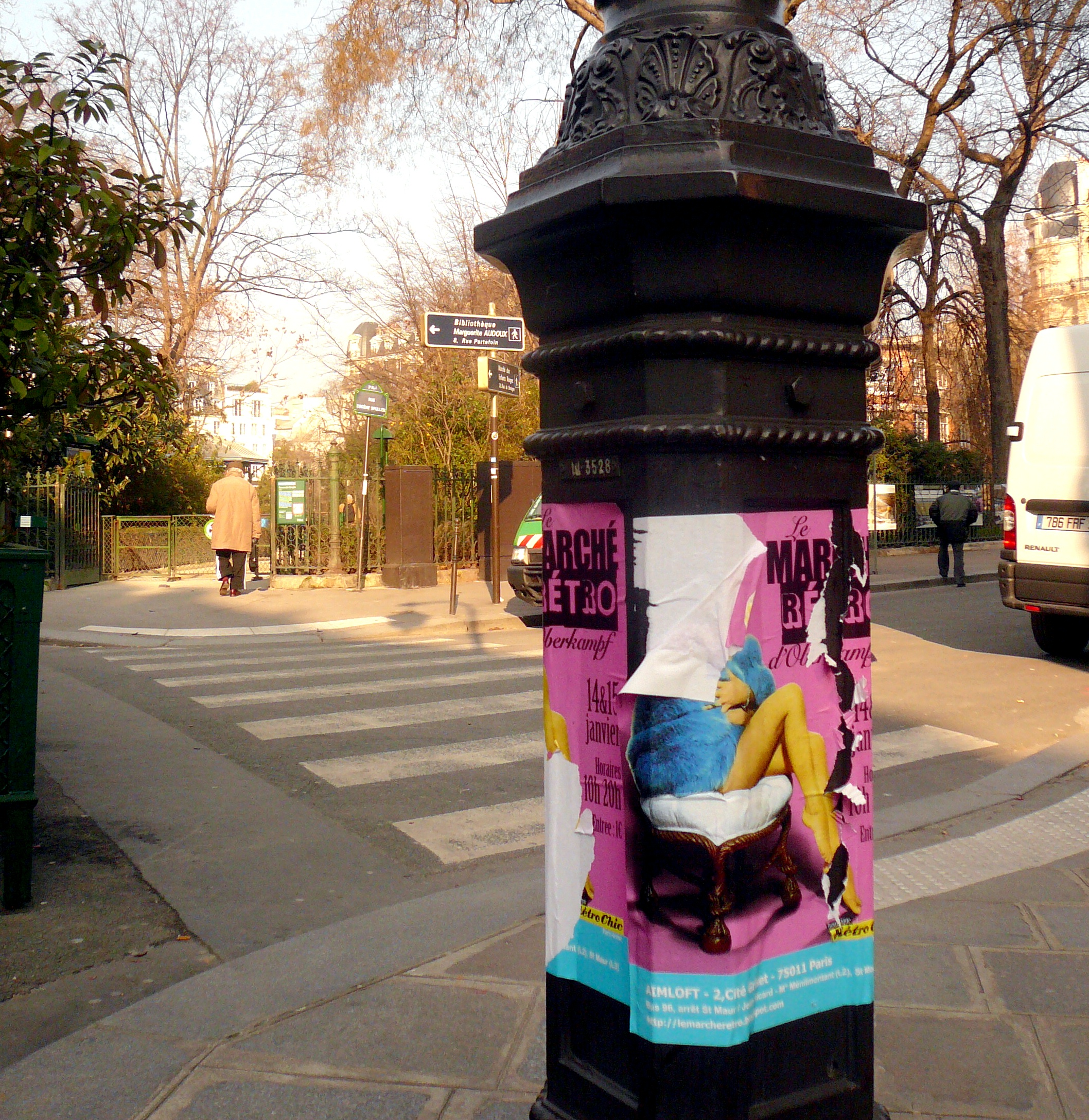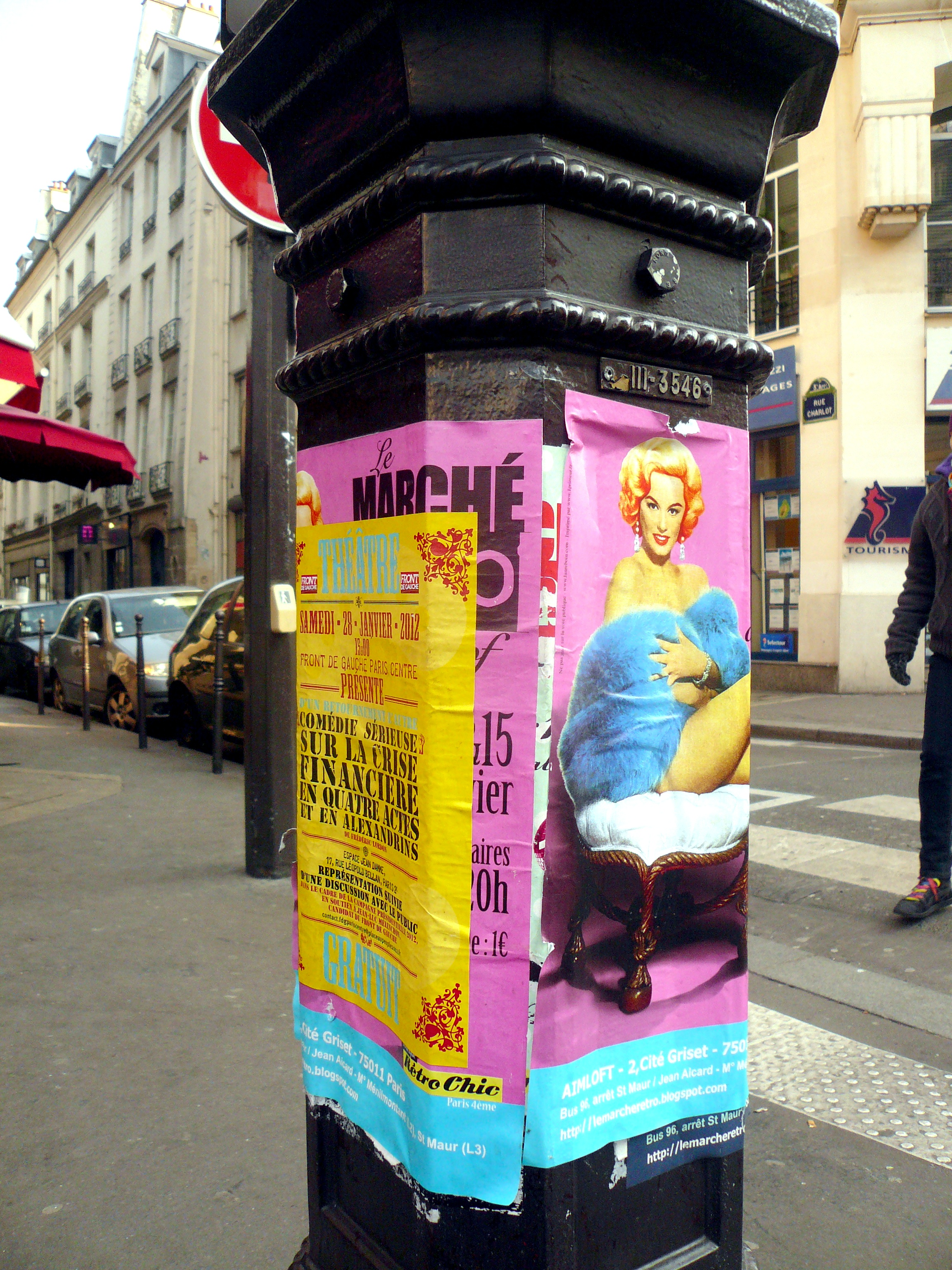 Comment alors ne voit-il pas, lui dont la mairie borde cette rue, lui qui vraisemblablement passe là tous les jours, que tous les jolis lampadaires "style Marais" qui en sont le mobilier urbain, sont défigurés par des affiches sauvages qui remontent à plusieurs semaines et forment une croute de strates superposées comme dans un mille-feuilles.