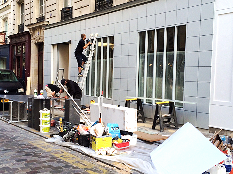Voilà une devanture en cours de création au 3 rue des Rosiers (IVe) qui, si elle semble de qualité, ne s’intègre pas dans le style architectural de l'immeuble dont elle fait partie ni dans la rue concernée dans un secteur régi par le PSMV (plan de sauvegarde et de mise en valeur) du Marais.
