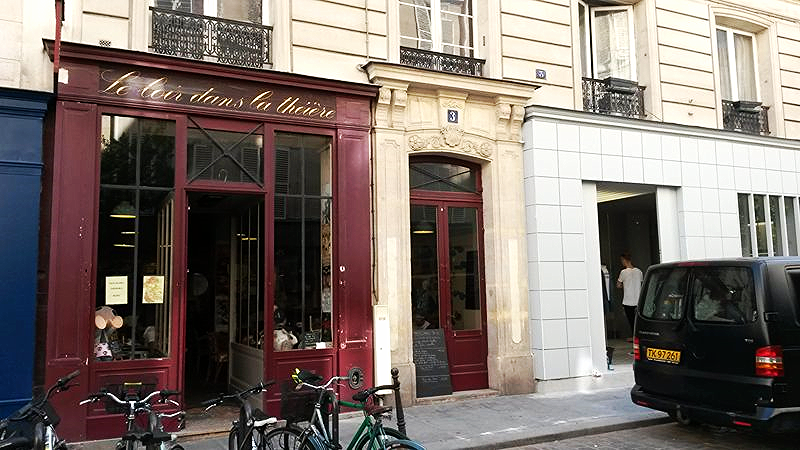 On peut en juger sur cette nouvelle photo qui focalise l'attention sur la jonction entre le pilastre de l'immeuble et la nouvelle devanture. Cette réalisation est d'autant plus choquante que de l'autre côté de la porte d'entrée de l'immeuble une devanture conforme aux exigences du Marais est en place depuis des années à l'enseigne du "Loir dans la théière".