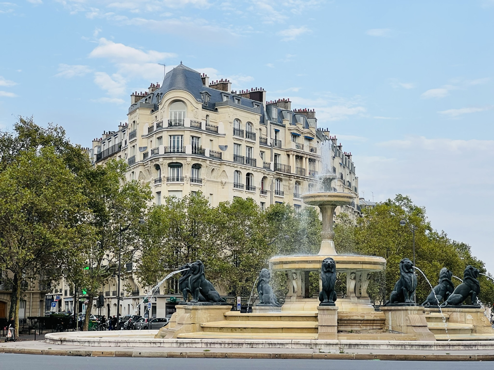 Le Paris qu'on aime : des fontaines ornementales en état de marche, une voirie entretenue, de grands arbres d’alignement et des façades parisiennes immédiatement reconnaissables. Place Félix Eboué (Paris XIIe) – Fontaine aux Lions (Gabriel Davioud – 1869) (Photo VlM/QD)