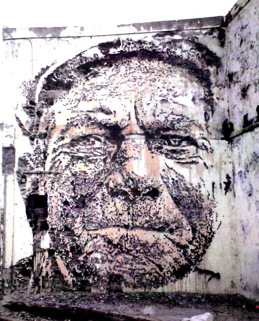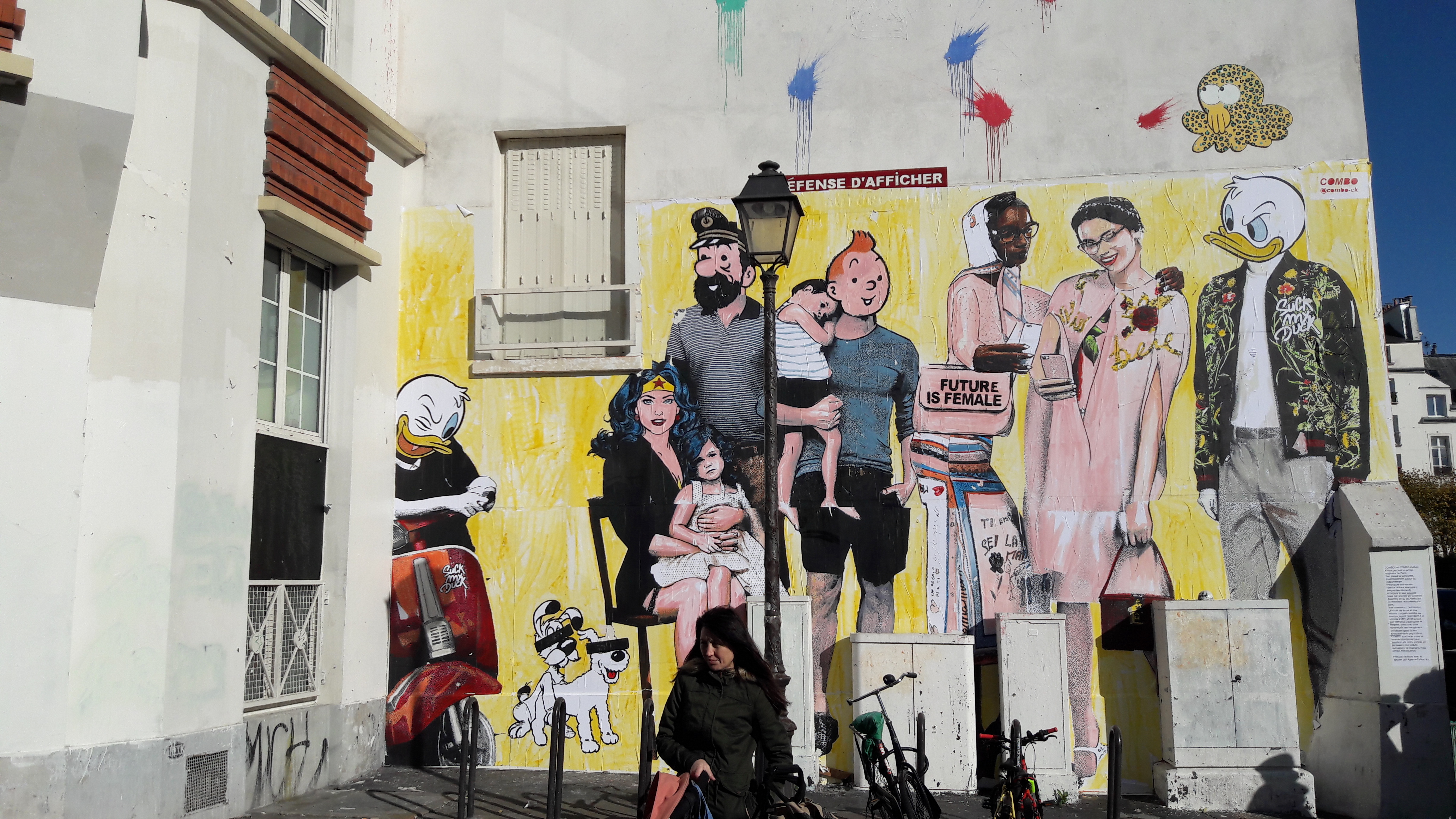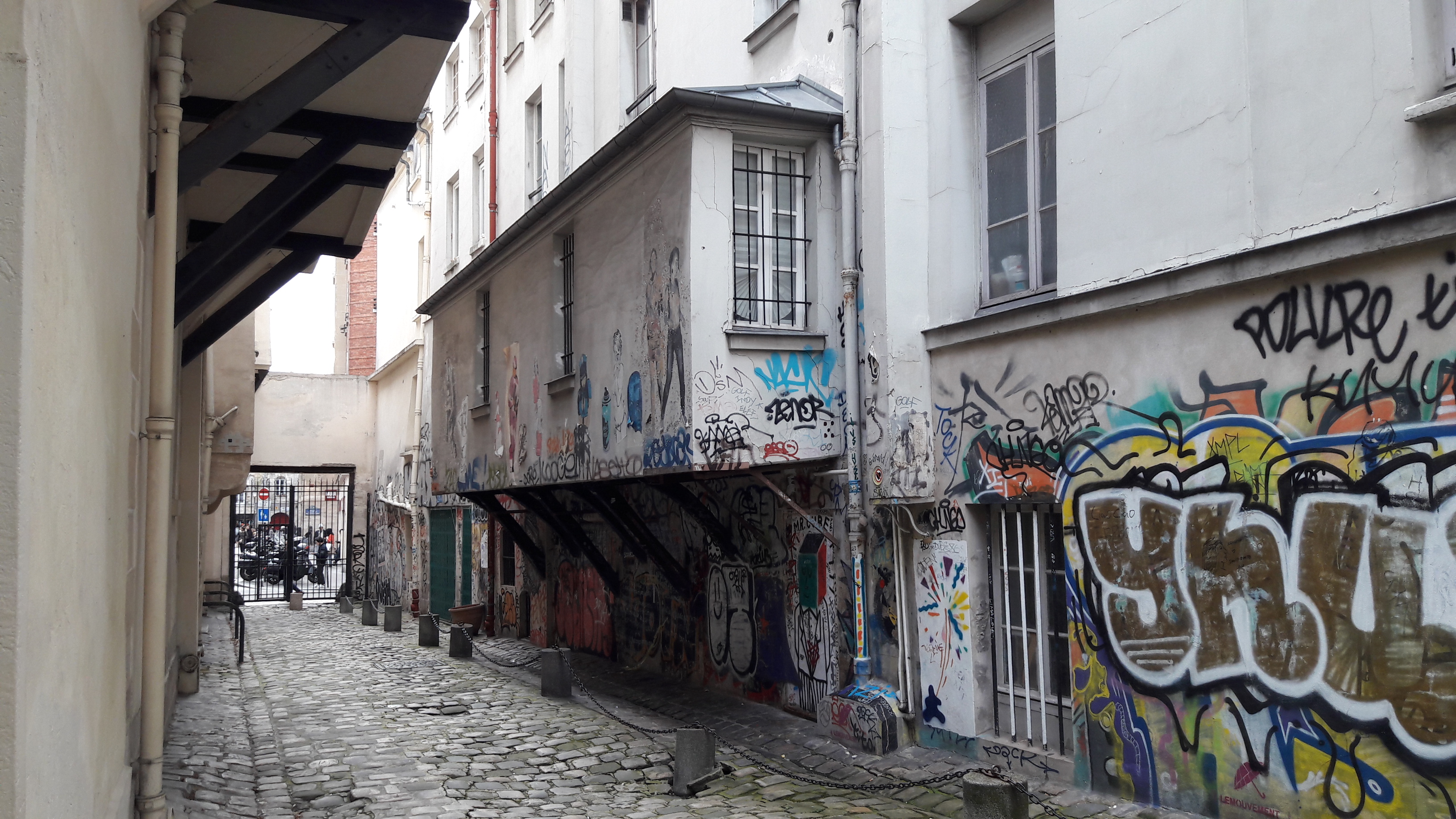 Dialogue : "Bonjour, vous avez le droit de peindre ici en secteur classé sauvegardé ?" – "oui j'ai la permission de la mairie, c'est une association qui gère ce mur et reçoit de l'argent de la mairie du 3ème et je suis payé par l'association… Pas très bien payé, mais c'est correct" nous dit le peintre. Belle idée en effet que de soutenir les artistes dans des espaces d'expression cadrés et réglementés plutôt que n' importe où… Hélas quant à la pérennisation des œuvres par principe éphémères, la mairie ne suit plus pour protéger le travail de l'artiste.