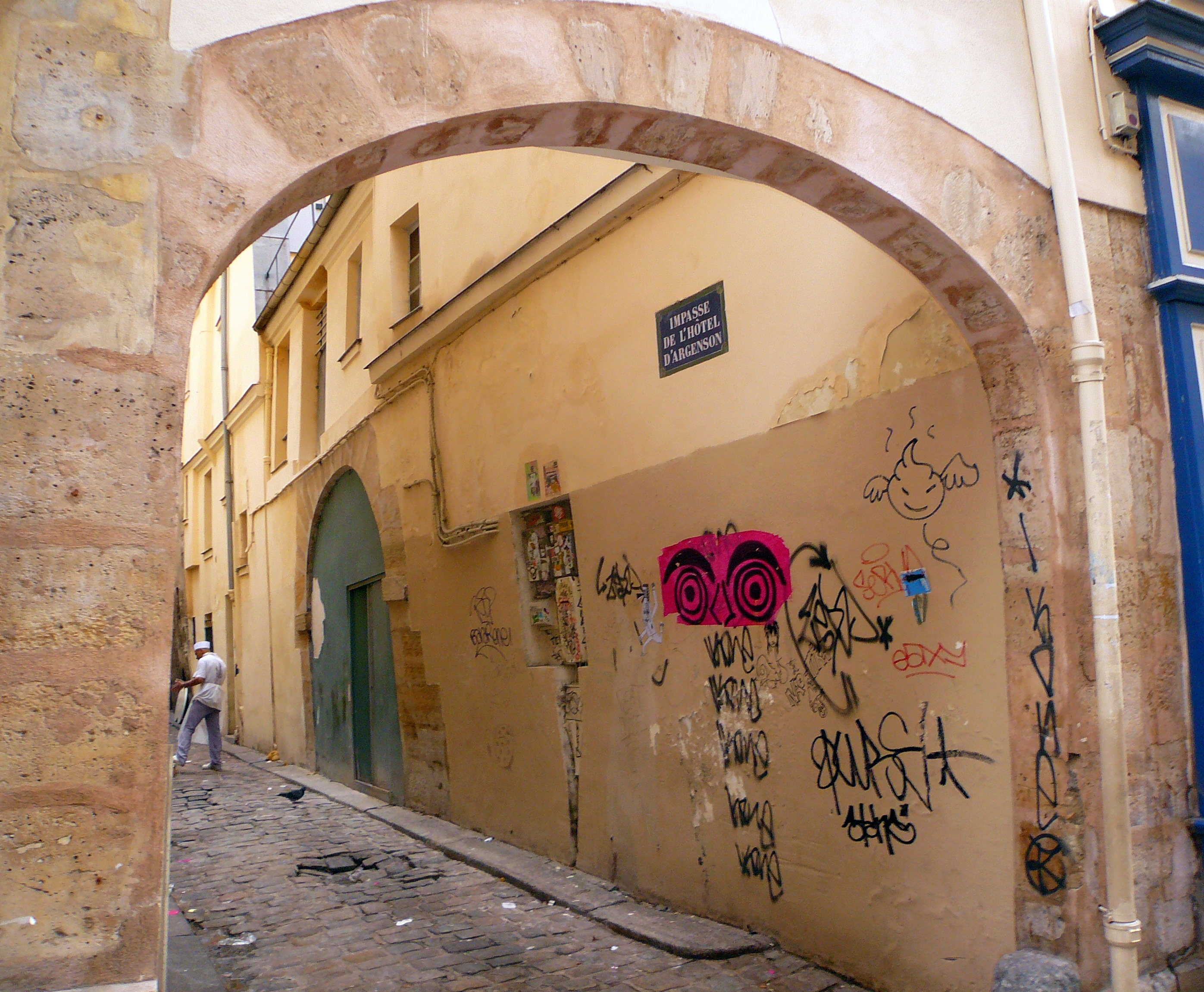On peut évidemment ne pas apprécier ses choix artistiques et les messages qu'ils véhiculent. Sont-ils conformes à l'esprit du Marais ? Sans doute pas si on se réfère à l'art et l'architecture des XVIIème et XVIIIème siècles mais le musée Picasso qui est tout près nous rappelle que le génie a diverses façons de s'exprimer et qu'il s'arroge le droit de bousculer les courants existants. On a affaire ici au street-art qui a ses codes et qui mérite de s'exposer. Pour autant qu'il agisse avec les autorisations requises….