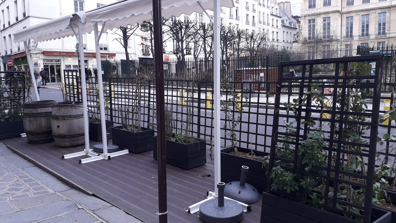 Les exemples ne manquent pas dans Paris-centre mais le pire a été évité car le Maire Ariel Weil a été vigilant et sensible à nos interventions. La place du Marché Ste Catherine a été évacuée, la terrasse-pergola du "Café Charlot" rue de Bretagne a disparu et la terrasse-palissade de la brasserie La Fronde a connu un début de rabotage sur sa longueur (il faut poursuivre !), débarrassée de son enseigne racoleuse. Les autres établissements, dans leur ensemble, ont eu une attitude raisonnable et responsable qui augure positivement de ce qu'il adviendra au sortir de la crise.