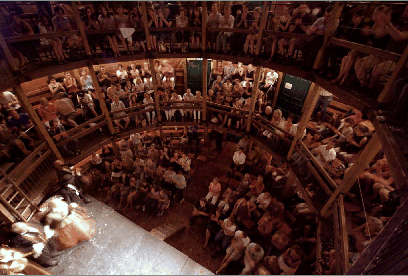 Ce bâtiment de 12 m de diamètre et près de 11 m de haut est en tous points dans l’esprit des théâtres anglais des XVIe et XVIIe siècles. Les spectateurs disposés en cercle au sol et dans les gradins sont au plus près des acteurs et de la scène. Le "Théâtre des Muses" qui a fait l’objet d’un article (31 janvier 2013) de "Vivre le Marais !" avait adopté cette disposition des spectateurs, mais ceux-ci étaient debout alors que dans le cas présent ils seront assis sur des chaises ou des bancs.