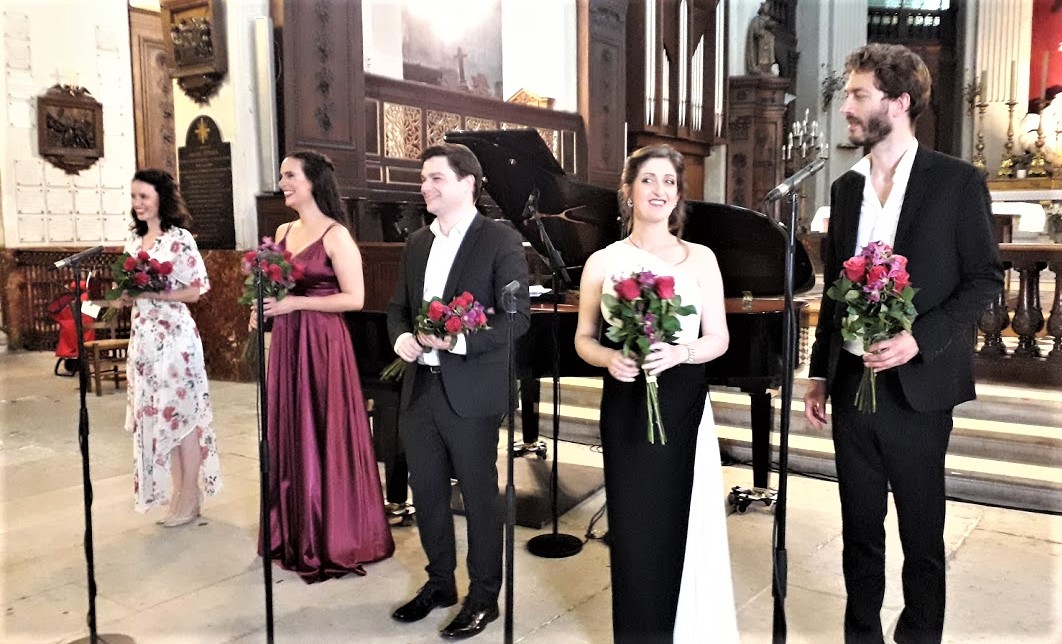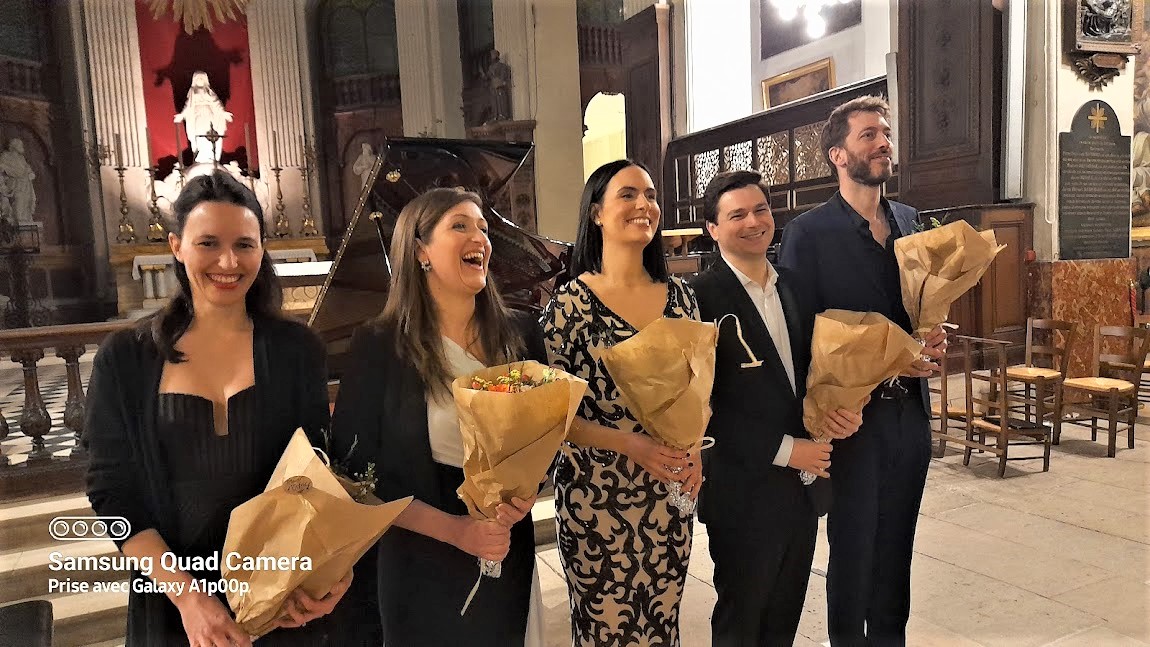 Salut final avec bouquets, avant le "bis". De gauche à droite : Magali Albertini piano, Pauline Feracci soprano, Lorrie Garcia mezzo-soprano, Kaëlig Boché ténor et Thibault de Damas baryton-basse (Photo VlM, clic gauche pour agrandir))