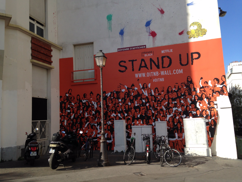 Je ne sais si la fresque orange criard qui a été peinte ce mardi 6 juin répond à cette appréciation. Mais, sous les prétentions artistiques de ce projet, se dissimule de la publicité commerciale pour des marques ou des produits que reconnaissent immédiatement les hipsters, et auxquels renvoient les # des affiches. En réalité, la fresque en question nous annonce ainsi le retour d’une série télévisée,  « Les Filles de Litchfield »[3].