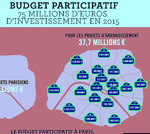 Panneau de la Mairie annonçant le montant du budget participatif 2015 et sa répartition par arrondissement