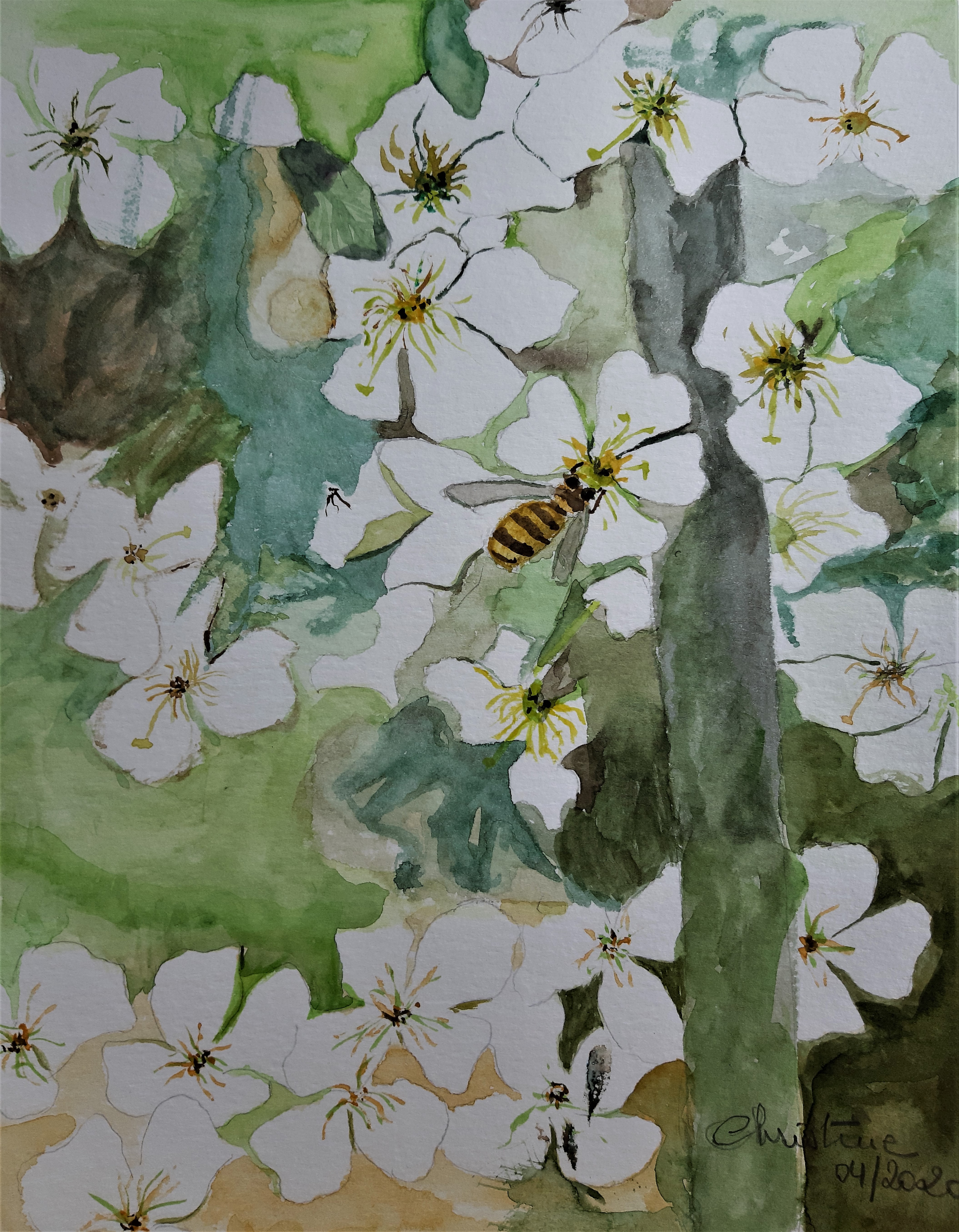Aquarelle de Christine Albertin-Simonet : "abeilles et pollinisation"