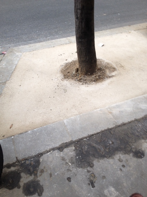 Saccages et vols ont eu raison des essais de plantations autour de certains arbres de la rue Beaubourg, leur pourtour est aujourd'hui en partie cimenté (Photo VlM)